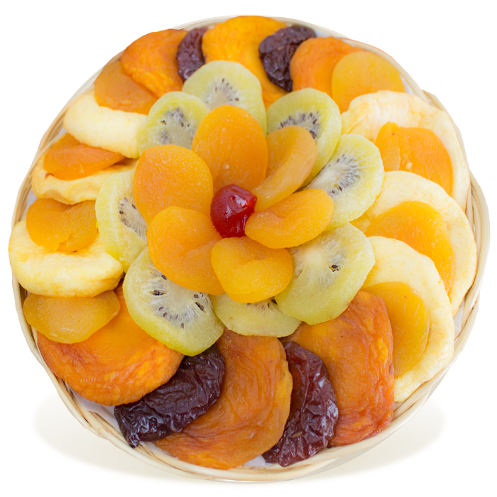 A delightful assortment of Turkish Apricots, Peach Slices, Plums, Kiwi topped with a Candied Cherry. Hand arranged on a wicker basket.