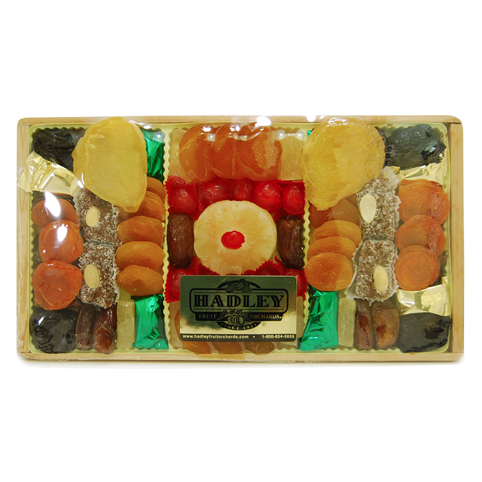 A perfect blend of Deglet Noor Dates, Fancy Apricots, Jumbo Prunes, Candied Cherries, Apricots, Sweetened Pineapple and Coconut Date Rolls. All hand arranged on a handsome wooden tray, ready for elegant entertaining.