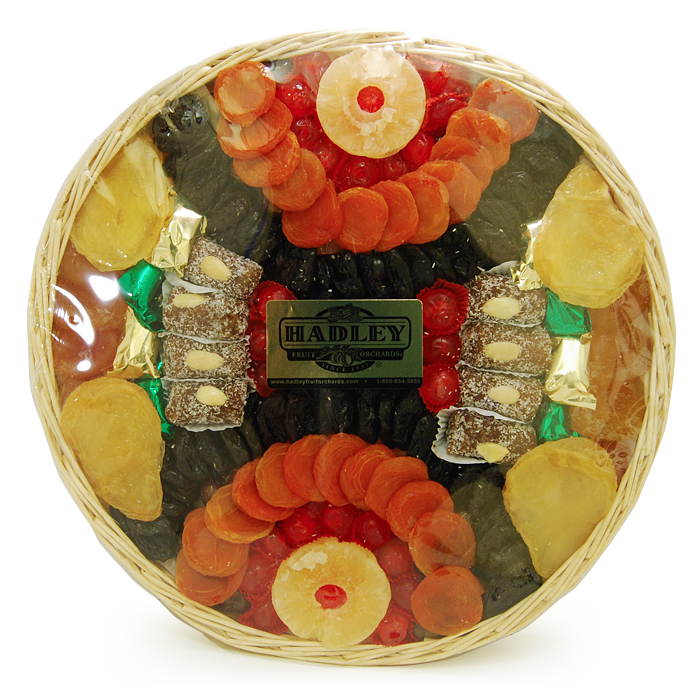 Treat family and friends like royalty with this assortment of moist Deglet Noor Dates, Dried Apricots, plump Prunes, sweetened Pineapple, Candied Apricots and Cherries, and Date Coconut Rolls. Hand arranged on a wicker basket.