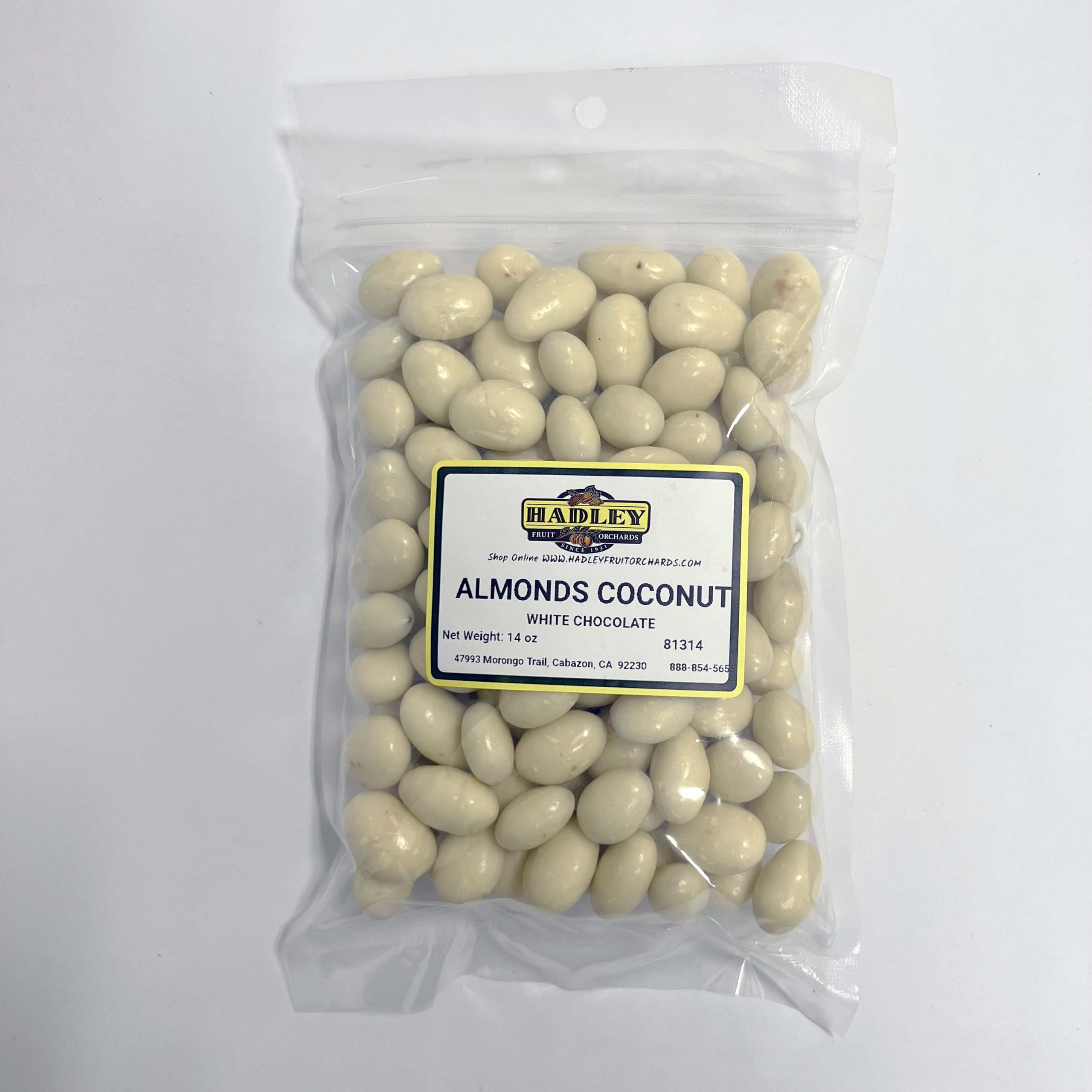 Ingredients: White Chocolate (sugar, cocoa butter, whole milk powder, soy lecithin- an emulsifier, natural vanilla flavor), Almonds, Sugar, Coconut, Tapioca Dextrin, Natural Flavor, Confectioners Glaze. Net Weight: 14oz C.O.O USA
